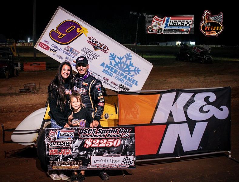 HATTIESBURG, MS – June 2, 2023 - Derek Hagar of Marion, AR won his fifth straight United Sprint Car Series Speedweek race on Friday night at Hattiesburg Speedway driving the Ameripanel Special after leading all 30 laps of the Feature Race. Hagar will have the broom in his hand tomorrow as he tries to make history.